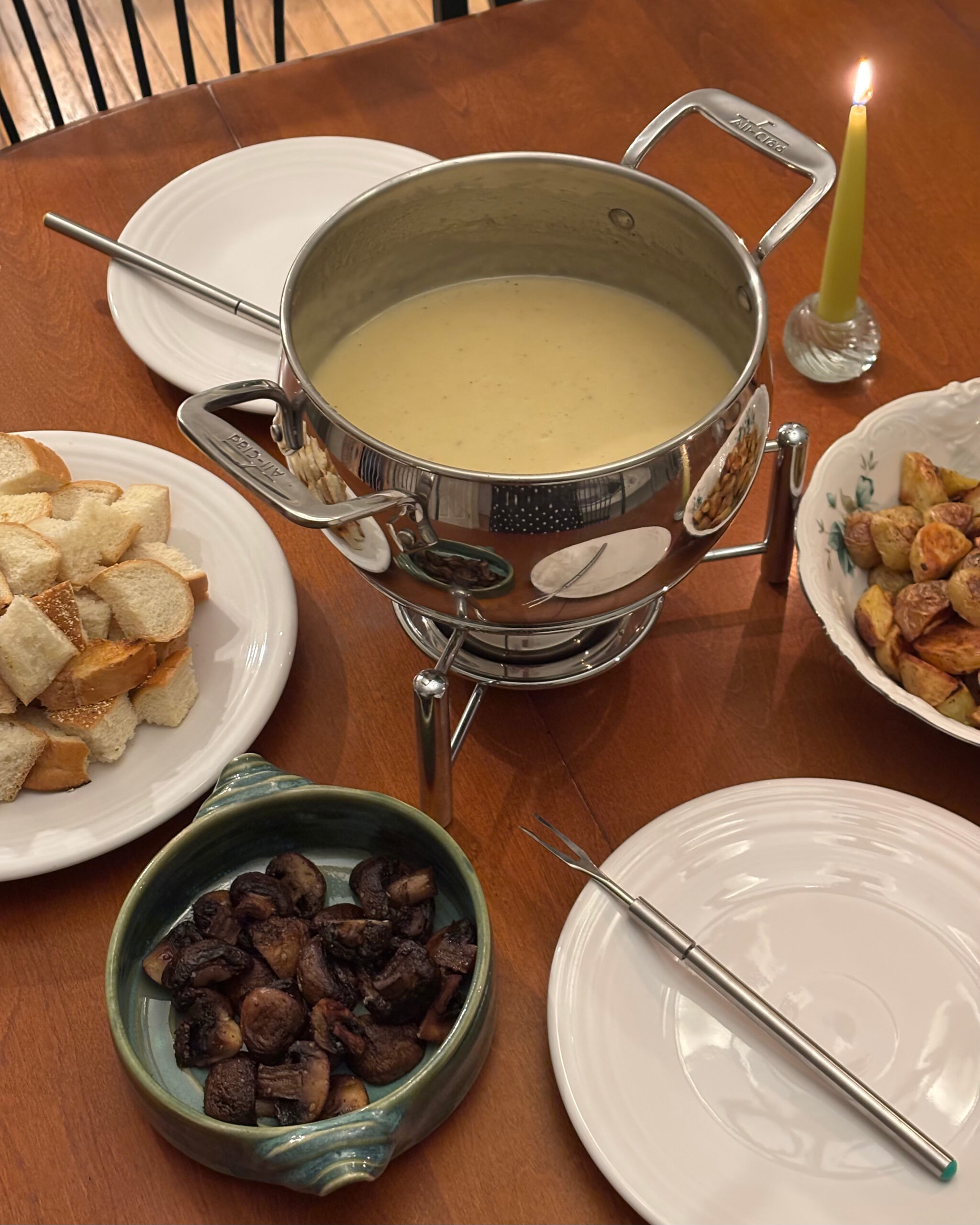 I like to pair fondue with a few varieties of bread, like a baguette and an italian loaf, cubed and lightly toasted. I also usually make roasted potatoes – mini yellow potatoes cut in half and tossed with olive oil, salt, pepper, and garlic powder and then baked until crispy. I give a similar treatment to sliced mushrooms and they are divine! Other pairings that work nicely are apples and the veggies you’d typically find on a cruidte platter, like broccoli, carrots, tomatoes, and peppers.
